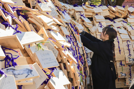 大学入学共通テストなどの受験シーズンを前に10日、東京都文京区の湯島天満宮に受験生らが奉納した合格祈願の絵馬が鈴なりに掛けられている。神社によると約5万枚の絵馬を用意しているという。 【時事通信社】