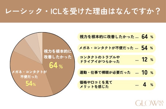 - 施術を受けた理由は「視力を根本的に改善したかった」64%が最多で、次いで「メガネ・コンタクトが不便だった」54%が多かった。