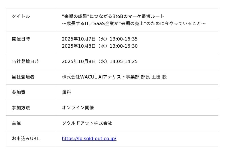 データと知見を核に、戦略から実行までマーケティングDXを一気通貫で支援する株式会社WACUL(本社:東京都千代田区、代表取締役社長:大淵 亮平、読み:ワカル、以下当社)は、10/7(火)~10/8(水)に開催されるセミナー【“来期の成果”につながるBtoBのマーケ最短ルート~成長するIT/SaaS企業が“来期の売上”のために今やっていること~】に登壇いたします。