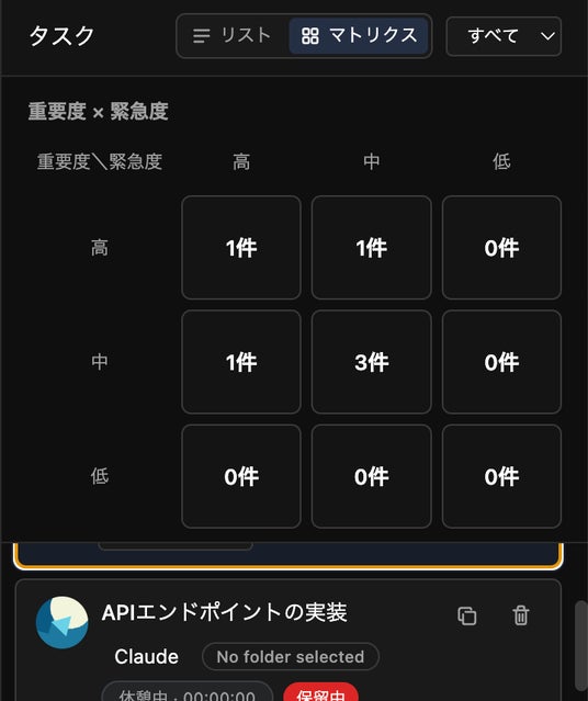 大量のAIタスクを優先度マトリクスで管理。重要度と緊急度を可視化し、AIエージェントが自律的にタスクステータスを更新します。