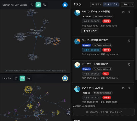 AIタスク管理: 複数のAI CLIツールを統合管理。 Claude Code(MCP連携可), Codex CLI対応
