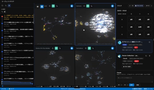 KAMUI 4D Editorは、時間軸を含む4次元空間でプロジェクトを可視化・管理する統合開発支援プラットフォームです。ファイル構造、Git履歴、AIタスクを3D空間にリアルタイムで表示し、直感的な操作で複雑なシステムを理解・管理できます。