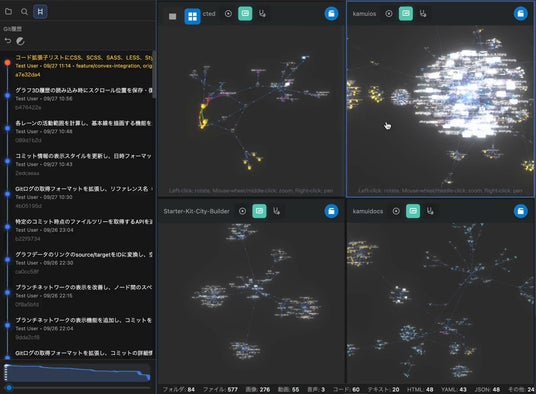 タイムライン上でコミット履歴を辿ることで、プロジェクトの時間的変遷を4次元で追跡。各コミット時点でのファイル構造を瞬時に可視化します。
