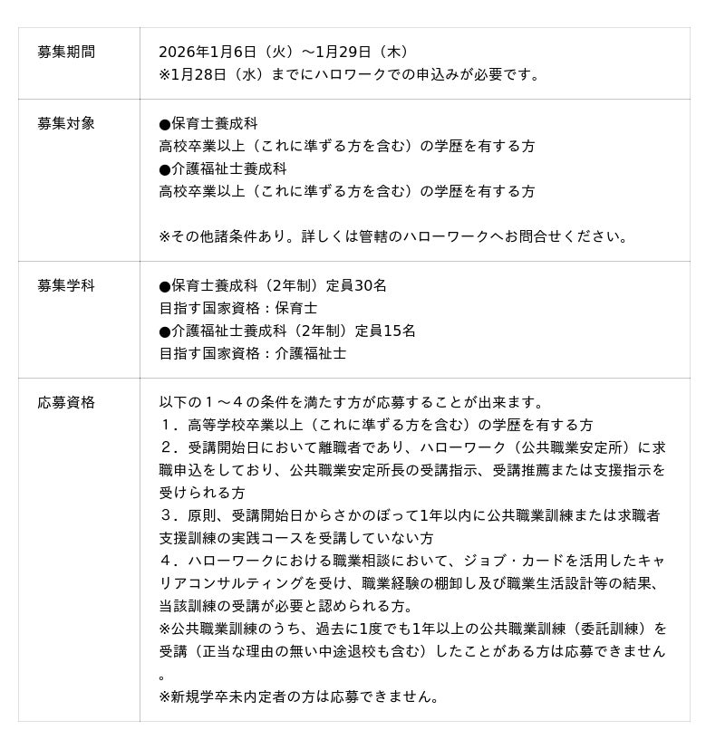 保育士・介護福祉士分野では、2年間の通学訓練を通じて、基礎知識から実践的な技術まで体系的に学ぶことができ、修了後には国家資格(保育士資格・介護福祉士国家試験受験資格)を取得できます。授業料は公費により 無料(教材費等は自己負担)で、経済的負担を抑えながら専門職としてのキャリアを確立できる点が特徴です。