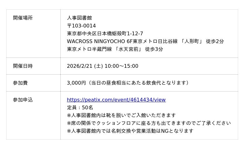 株式会社Trustyyle(本社:東京都中央区・代表取締役:吉田洋介)は、運営するコミュニティ「人事図書館」主催にて、2026年2月21日(土)10:00より、対話型イベント「人事図書館ラーニングバー『経営から頼られる人事になるには?』」を最大キャパシティの定員50名で開催いたします。