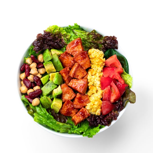 発酵サウザンの彩りパワーサラダ  1,540円野菜とタンパク質を摂ることができるバランスの良いサラダ。香ばしく仕上げたBBQ味の車麩、ビーガン卵「ノットエッグ」、KOMBUCHAマリネ液に漬け込んだ発酵ミックスビーンズをトッピングしました。