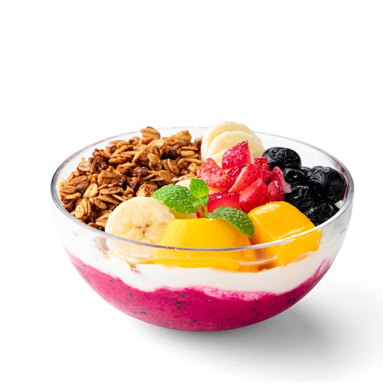 旬の果実、砂糖不使用・乳不使用の豆乳ヨーグルトクリーム、カラメルのような香ばしいデーツシロップをよく混ぜてお召し上がりください。