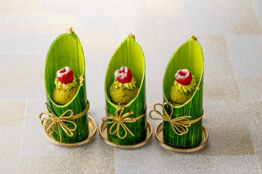 新年に幸運を呼び込む門松をスイーツで表現した「KADOMATSU」は、竹を模したホワイトチョコレートの器が目を引く一品です。器の中には伝統菓子ルリジューズを忍ばせ、シュー生地には京都産宇治抹茶とフェルクリン社オーパス ホワイト 35%に酒粕とカスタードを合わせた香り豊かでなめらかなクリームを詰めました。さらにそのクリームに寄り添うように花梨と洋梨のコンフィチュールを重ねることで上品な甘みとほのかな香り、そして爽やかな果実味が調和し奥行きのある余韻を生み出しています。