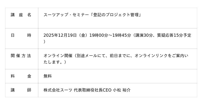 株式会社スーツ(所在地:東京都千代田区、代表取締役社長CEO:小松 裕介)は、2025年12月19日(金)19時から、当社代表の小松が講師を務めるスーツアップ・セミナー「登記のプロジェクト管理」を無料開催します。