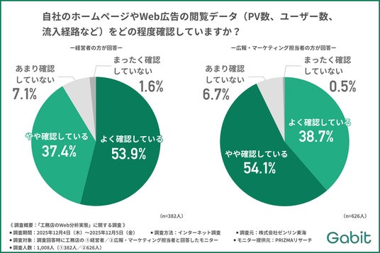 はじめに、「自社のホームページやWeb広告の閲覧データ(PV数、ユーザー数、流入経路など)をどの程度確認していますか?」と質問したところ、経営者の約9割が『よく確認している(53.9%)』『やや確認している(37.4%)』と回答しました。