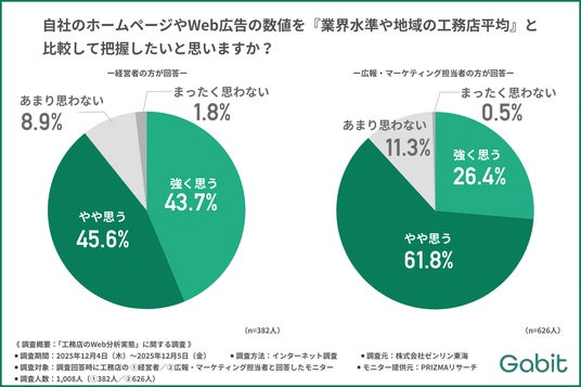 「自社のホームページやWeb広告の数値を『業界水準や地域の工務店平均』と比較して把握したいと思いますか?」と質問したところ、経営者の約9割が『強く思う(43.7%)』『やや思う(45.6%)』と回答しました。