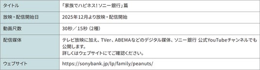 ソニー銀行株式会社(代表取締役社長:南 啓二/本社:東京都千代田区/以下 ソニー銀行)は、世界中で愛され続けている「スヌーピー」でおなじみの、チャールズ M. シュルツ氏原作のコミック「PEANUTS」を起用した新CMを2025年12月より放映・配信を開始しましたので、お知らせします。
