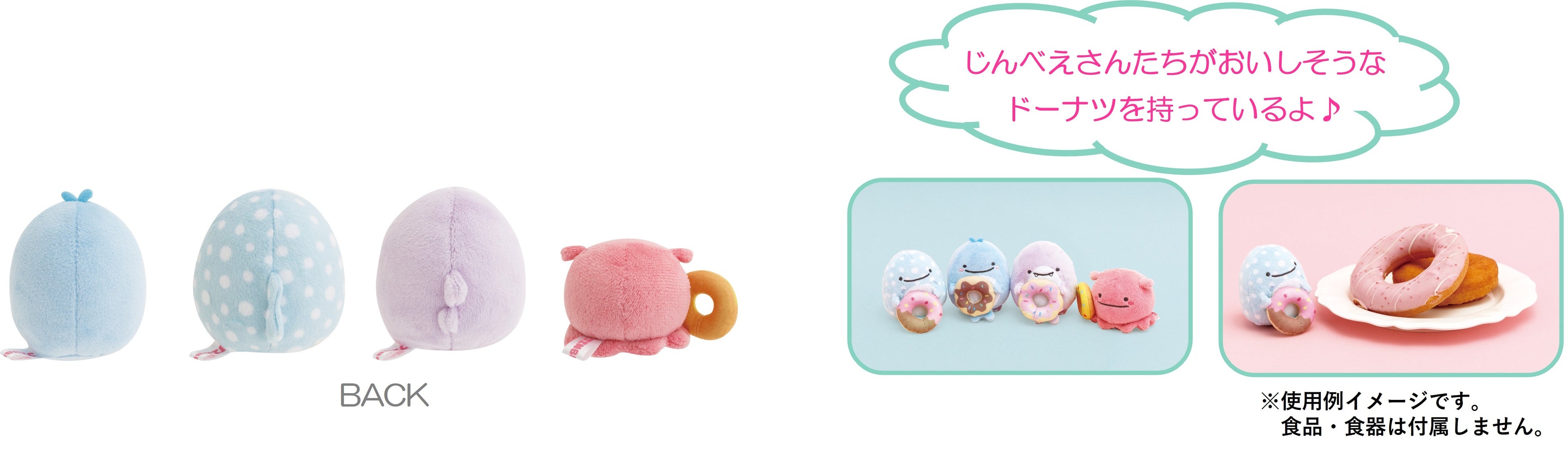 今回のテーマは、じんべえさんとポップでカラフルなドーナツをモチーフにしたデザインで、ドーナツ風のかわいいポーチをはじめ、ドーナツにはさまったじんべえさんたちのぬいぐるみ、じんべえさん風のドーナツを再現したクッションなど、集めたくなるグッズが勢ぞろいします。